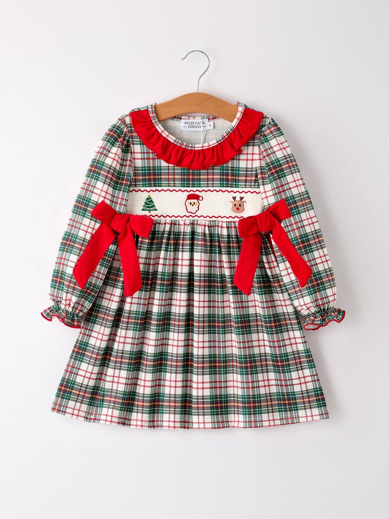 Christmas Embroidery Smocking Bow Plaid Girls Dress
